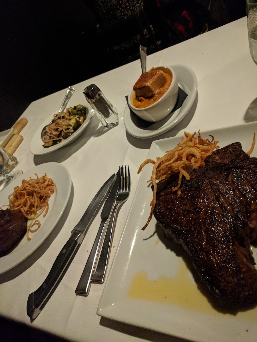Came here for a work dinner and had a great time. Service was on point, friendly and professional. Food was amazing! Started with the crab cake and steak tartare, both were delicious. I got the pork chop, two colleagues got the filet and one got the sea bass. We got the Mac n cheese, creamy spinach, Brussel sprouts, truffle wedges, and sweet potato. Brussel sprouts could have been better if they had a bit of a char on them but that's just my opinion. Everything was excellent.